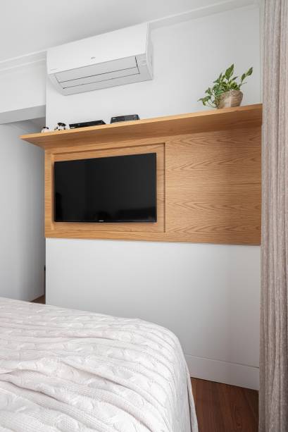 Além disso, o banco ripado, confeccionado com o mesmo material, completa a atmosfera sofisticada do dormitório.