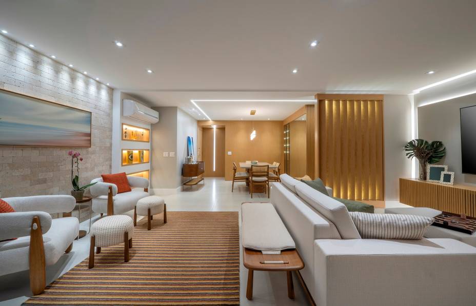 Móveis e objetos decorativos são realçados pelo projeto luminotécnico neste apê