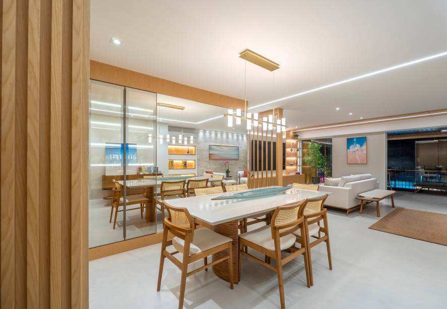 Os revestimentos – porcelanatos, tijolinhos em cimento rústico – em conjunto com a iluminação, com focos e perfis em LED, destacam os espaços e agregam modernidade e sofisticação na medida certa.
