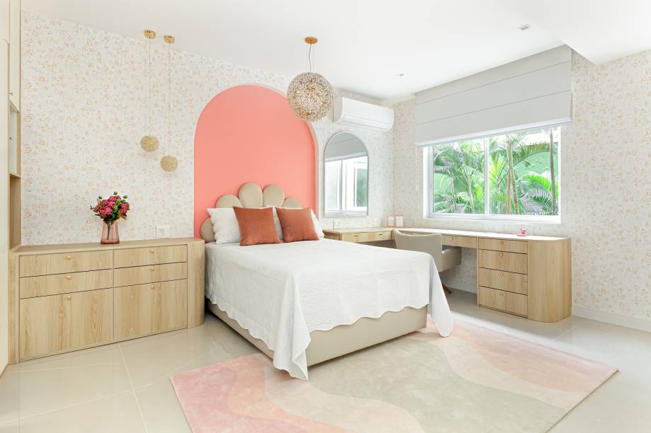 O quarto da filha, que tinha um pedido especial para ser rosa, foi uma exceção. “Optamos por dois tons de rosa nas paredes, complementados por detalhes em madeira e branco para destacar e criar um espaço vibrante e acolhedor, alinhado aos desejos da pequena”.
