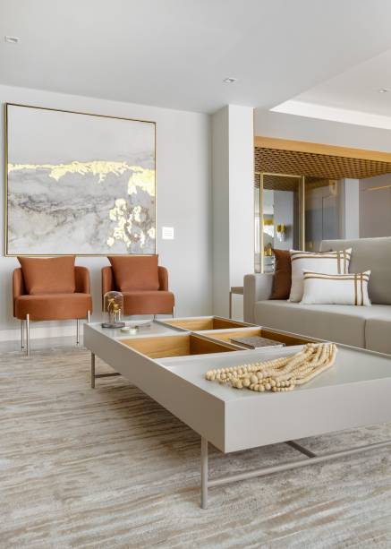 O quarto do casal foi projetado para oferecer luxo e aconchego, com tons dourados e textura em linho, criando um ambiente sofisticado e confortável. Um closet foi criado para cada membro da família, além de um escritório para o casal trabalhar e a filha estudar.