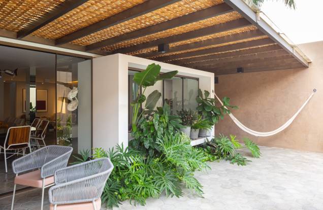 –Na estrutura da casa, destaca-se uma moldura branca, que cria um quadro de duas faces: do lado interno, abriga um confortável sofá e, do lado de fora, o generoso beiral recebeu plantas em vasos, que criam um volumoso jardim. A ideia do quintal, aliás, é uma interpretação tropical do conceito italiano cortile, que consiste em um pátio pavimentado, com poucos elementos, como uma rede, chuveirão e banco de madeira. O essencial para os momentos de relax a família.
