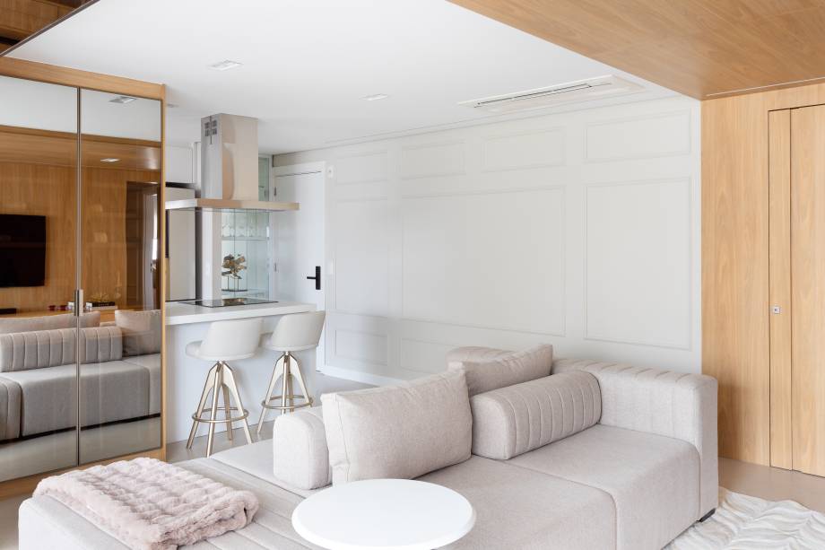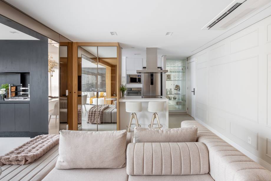 A parede que separava a cozinha da sala de estar foi removida, resultando em um ambiente integrado que se estende até a varanda gourmet. A paleta de cores em tons suaves, é marcada pela presença de elementos em madeira, bege e branco, o design clássico – boiserie, decora as paredes da sala, corredor e suíte principal, adicionando um toque de sofisticação e realçando a beleza atemporal.