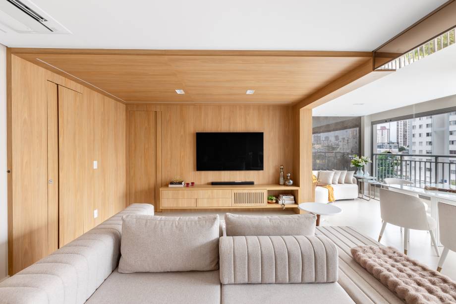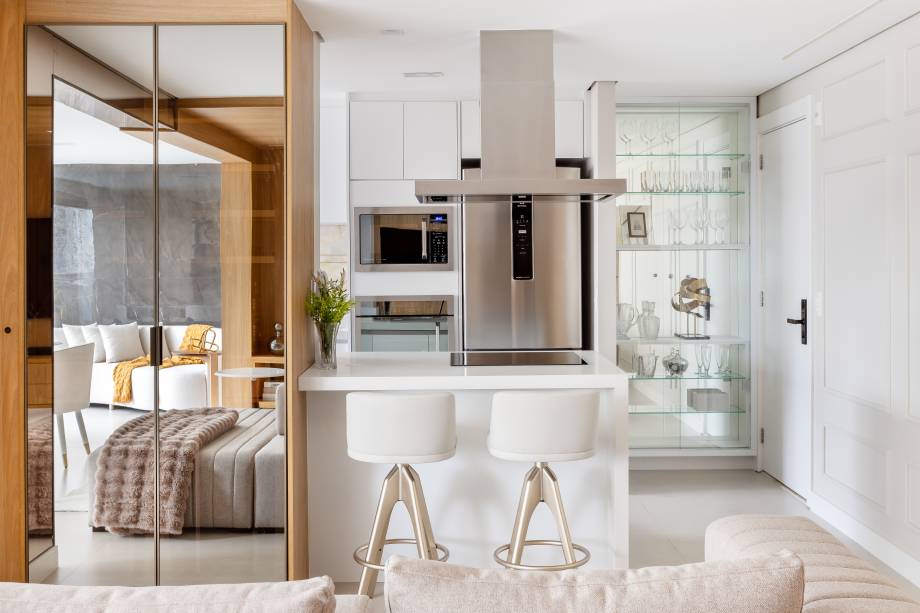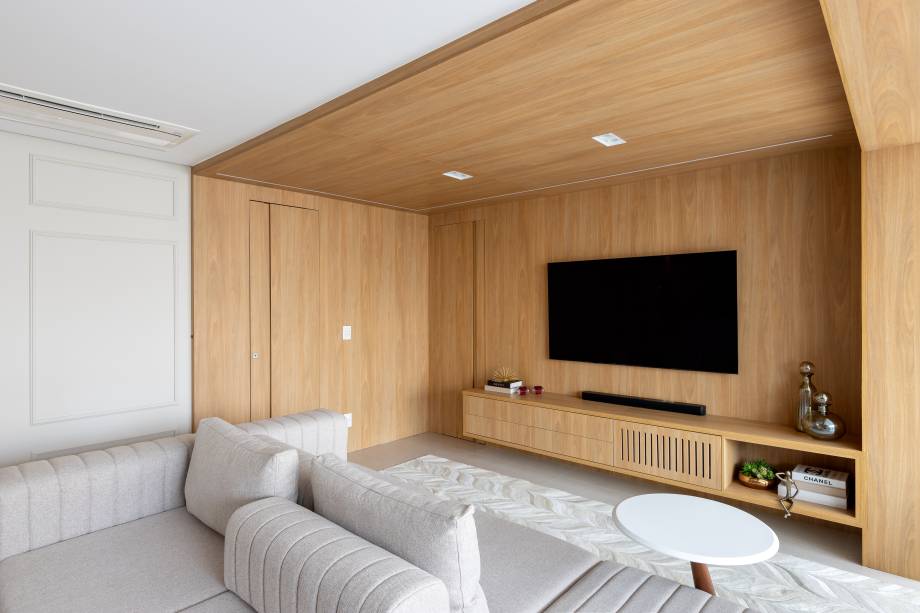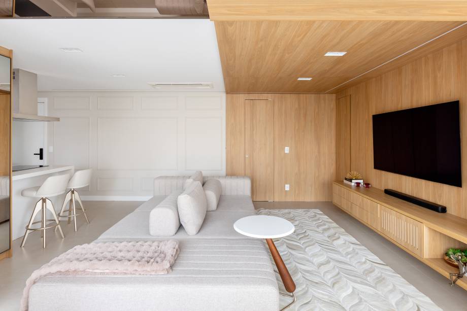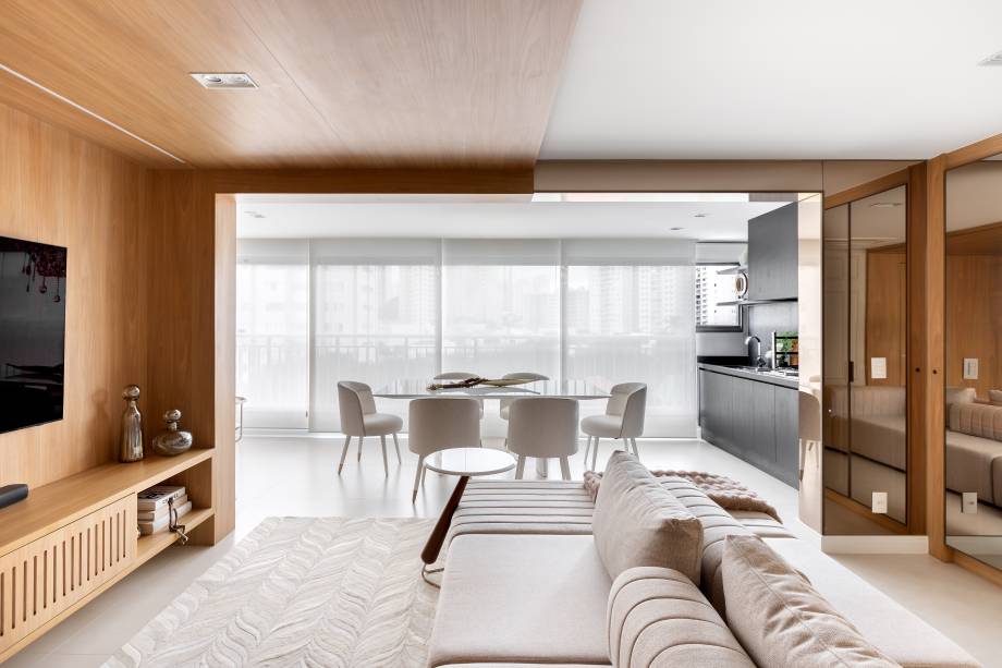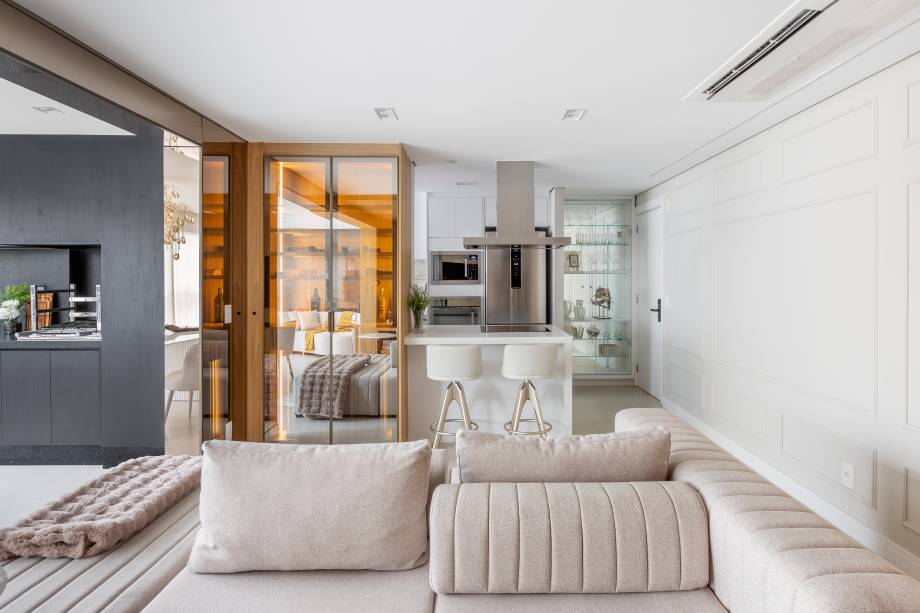 Já na sala de estar, um painel e um teto de madeira, desenhados em forma de caixa, conferem um ar contemporâneo ao ambiente. A sala ainda conta com uma adega climatizada, estrategicamente posicionada, oferecendo suporte e prateleiras repletas de vinhos selecionados, a frente de um sofá ilha, que faz um elegante contraponto à cozinha de tonalidade branca.