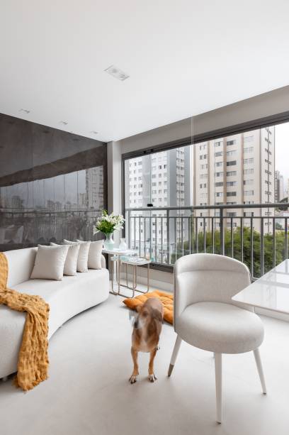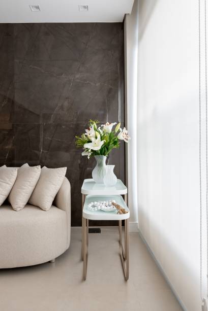 A varanda integrada conta com um sofá curvo e uma imponente parede de mármore.