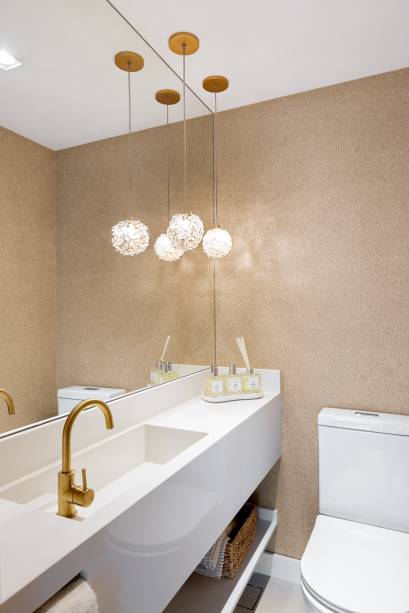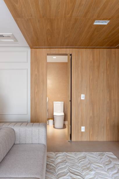 Um destaque da área social são duas portas mimetizadas: uma delas abre-se para um lavabo de estética refinada e detalhes em tons de dourado, enquanto a outra revela um corredor que leva a três suítes.