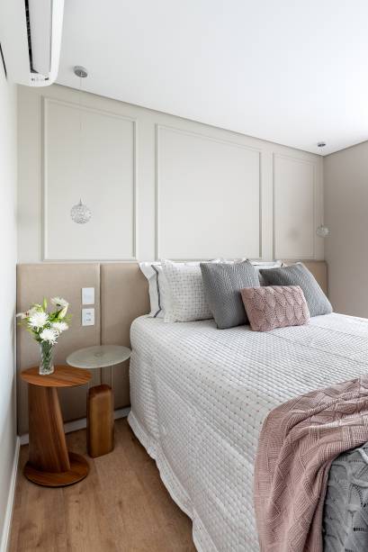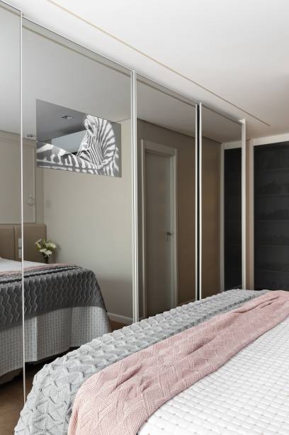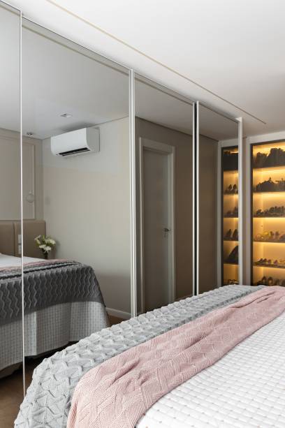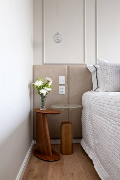 Na suíte master, a cabeceira estofada junto à televisão discretamente oculta no espelho da marcenaria cria um ambiente de puro conforto e uma experiência estética singular.