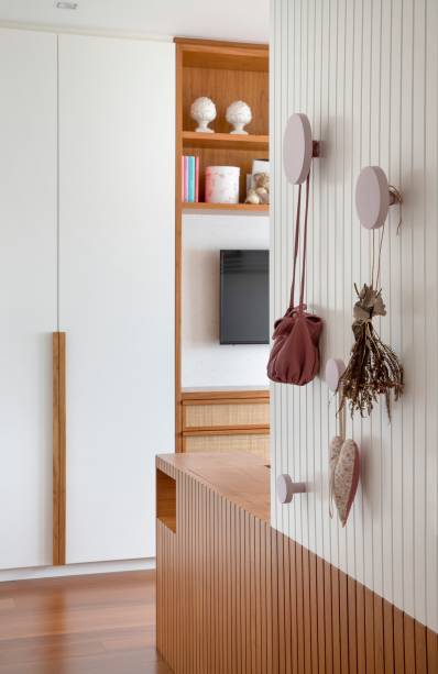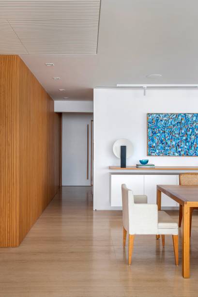 Para mimetizar os volumes do hall de elevadores e da cozinha voltados para a sala, as arquitetas revestiram as paredes com um grande painel ripado de Peroba-do-Campo, fazendo um contraste interessante com o piso claro. Repare que um trecho do teto da área social ganhou forro de madeira ripado em laca branca, com alçapão, usado como depósito das máquinas de ar condicionado que atendem as salas.