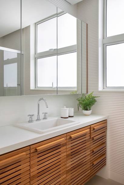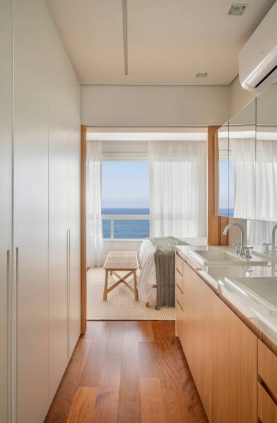 Na suíte master, as arquitetas propuseram um layout diferente para otimizar os espaços e melhorar a ventilação e iluminação naturais, sobretudo na bancada de apoio às cubas. Uma grande porta de correr em folha de madeira natural permite integrar totalmente o banheiro ao dormitório, trazendo amplitude visual, ou isolar os espaços, quando necessário.