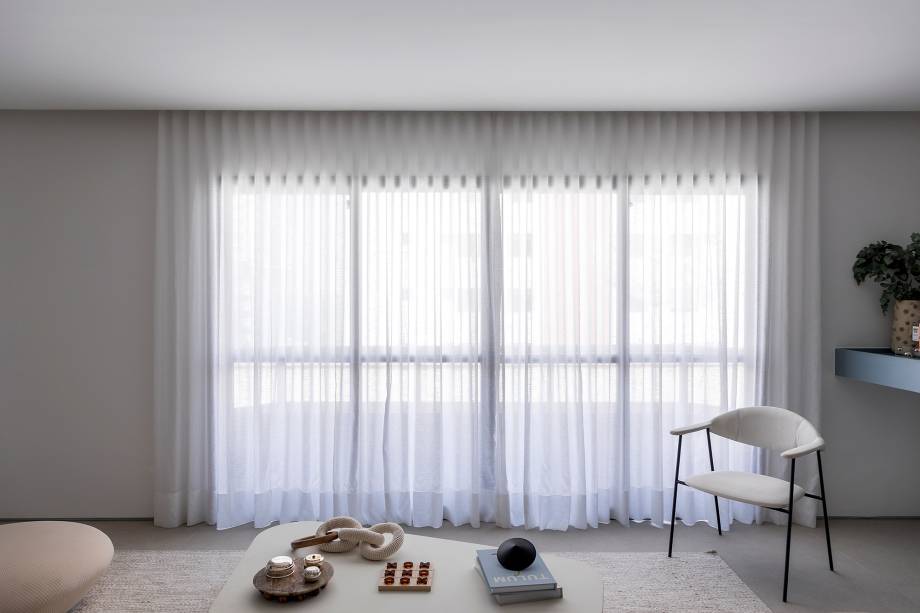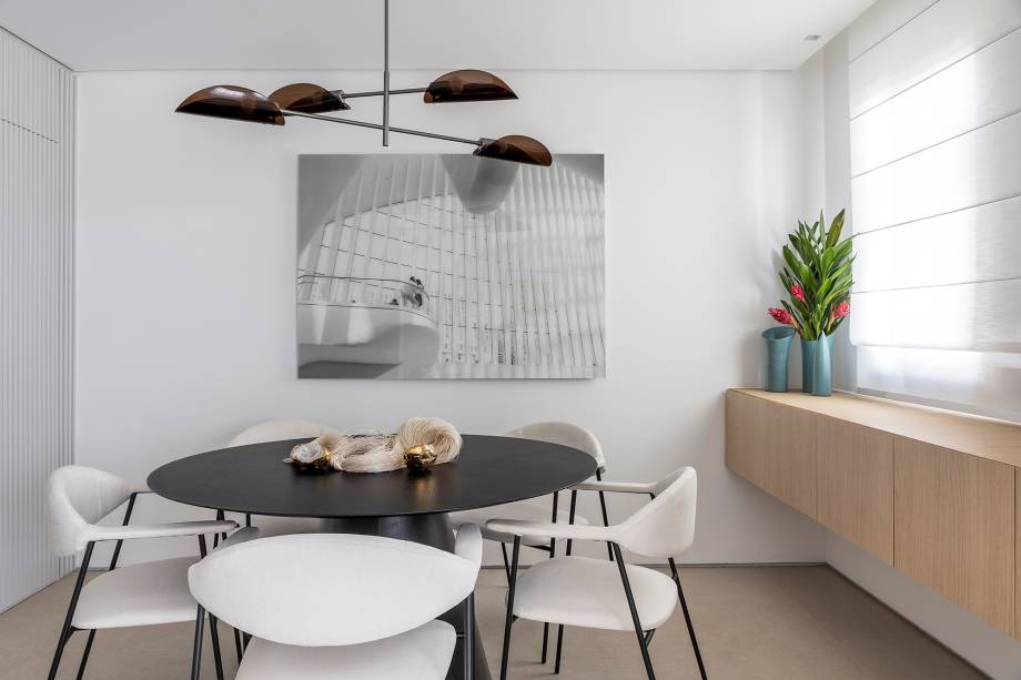 “A viga da sala para o corredor não permitiu que a gente abrisse o jantar completamente. Mas, no fim, aproveitamos a estrutura para criar o painel ripado“, explica o escritório.