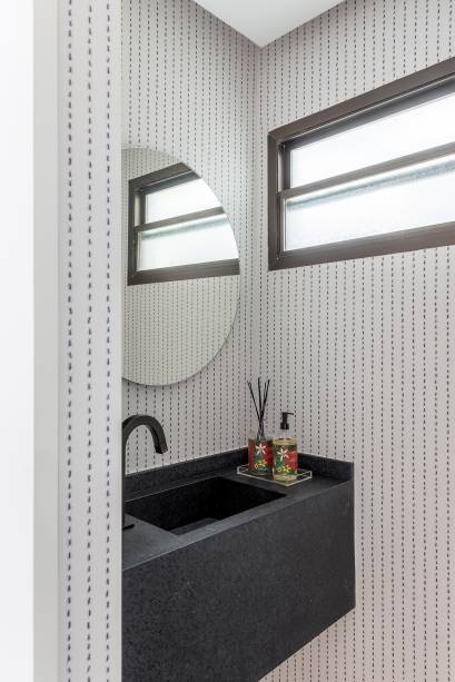 No lavabo, as riscas na parede são, na verdade, desenhos de formigas do papel de parede. A pia esculpida e o espelho redondo completam o ambiente.