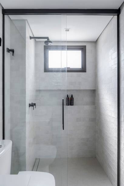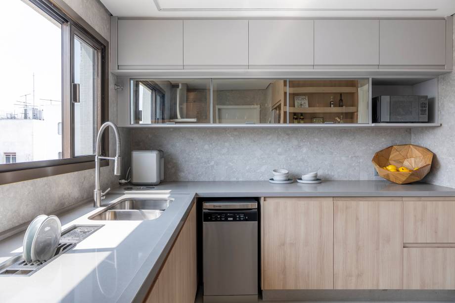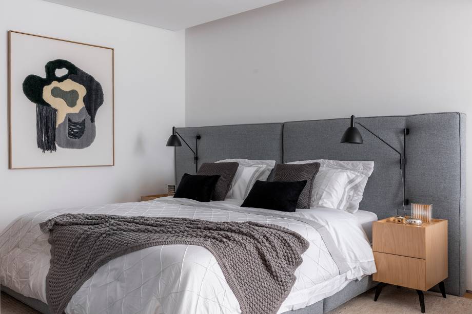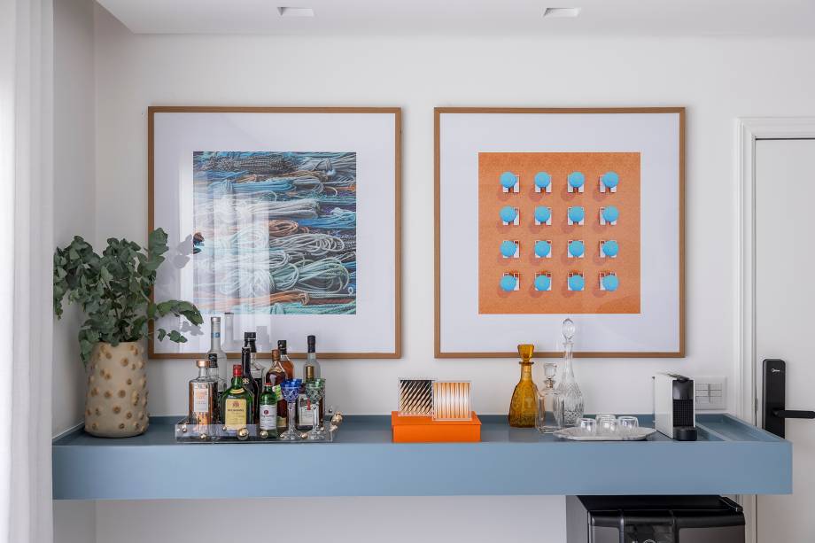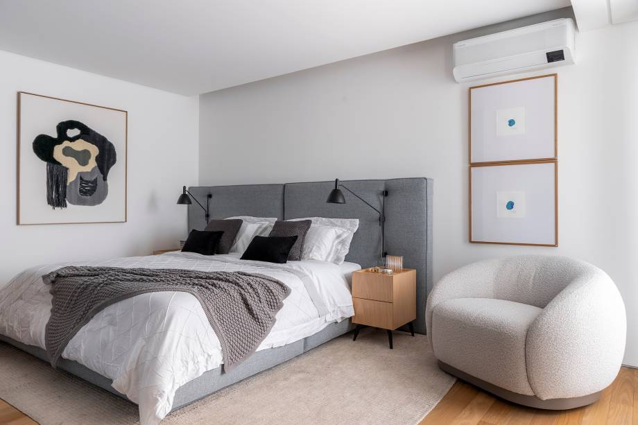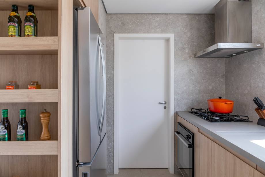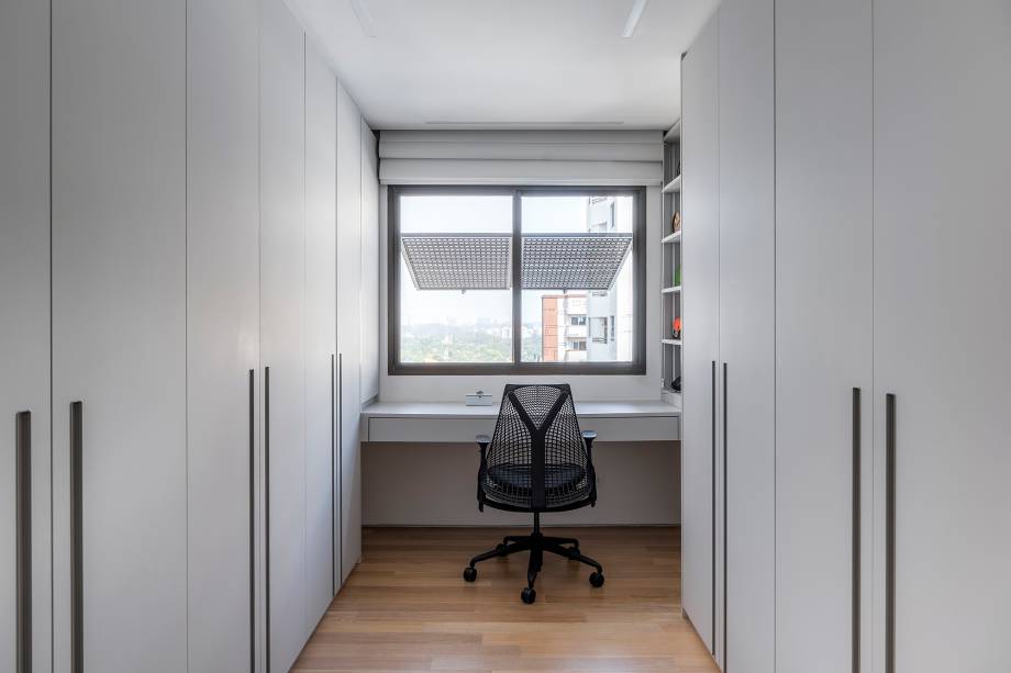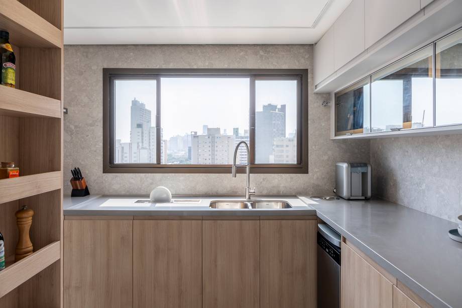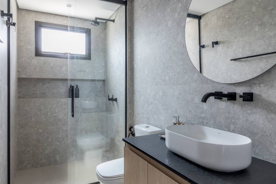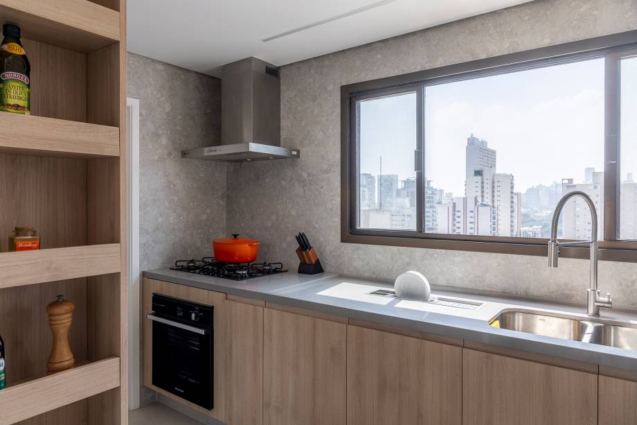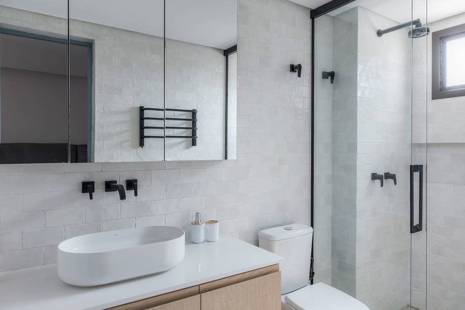 “Fizemos uma reforma total: troca de hidráulica, elétrica, contrapiso, derrubamos paredes e revestimos todas as áreas molhadas”, contam os profissionais. Entre os desafios encontrados no decorrer da obra, pontos estruturais como vigas e pilares foram descobertos e o layout sofreu algumas alterações.