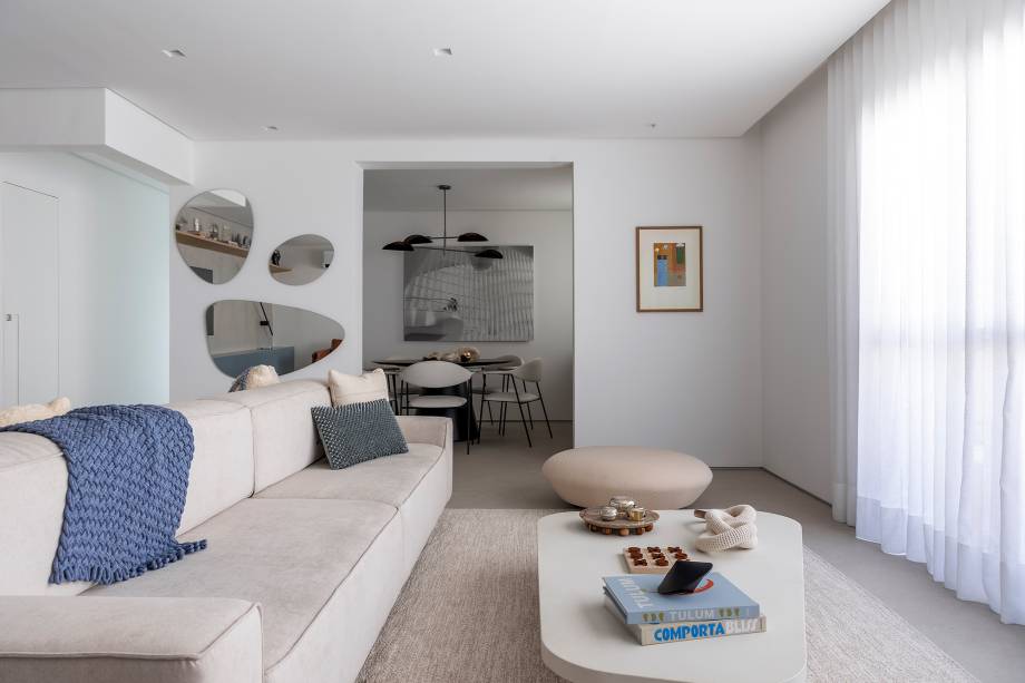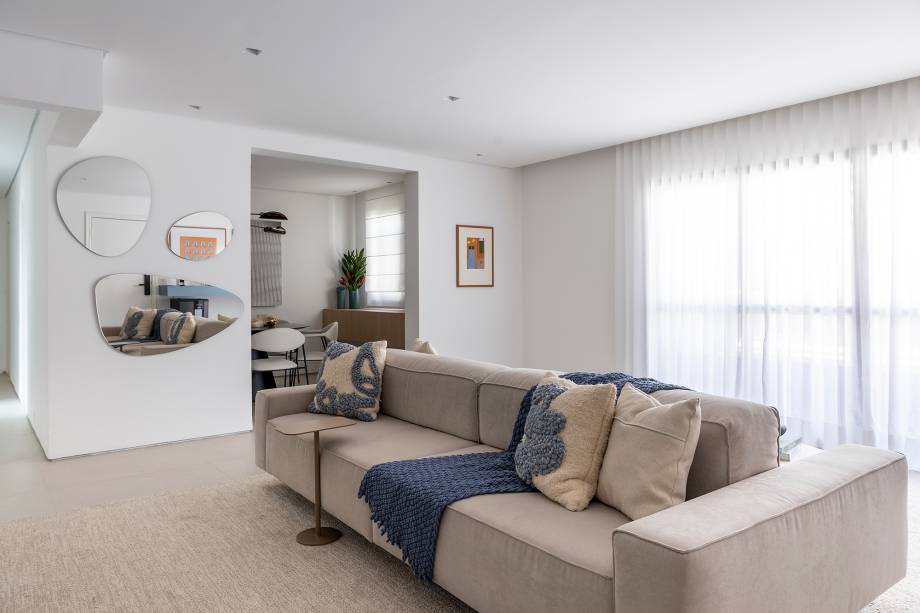 Como o pedido dos clientes era por uma ampla área para receber amigos, um living maior foi criado com a derrubada de paredes e um banco foi incorporado à varanda. O sofá duplo oferece mais assentos para convidados. O rack azul cria pontos de cor em meio à paleta neutra.