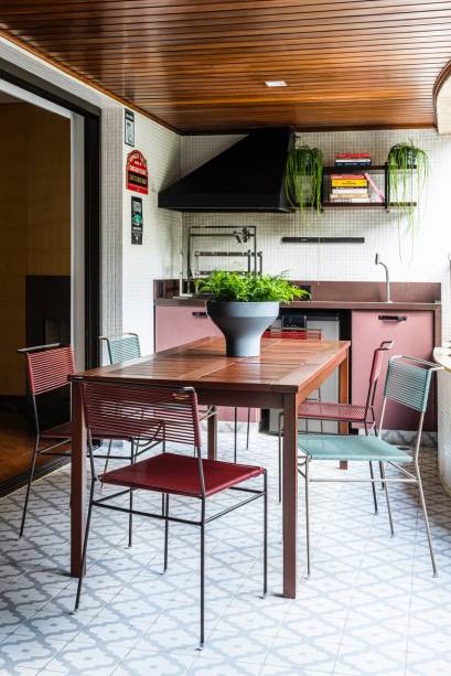 O projeto precisava ser muito despojado, com atmosfera de casa que é utilizada sem medo e com muita cor. “Me deram liberdade total no uso de cores”, diz. A parede de azulejo azul e amarelo – a principal da sala – confere personalidade a todos os ambientes e conecta visualmente o estar e a cozinha.