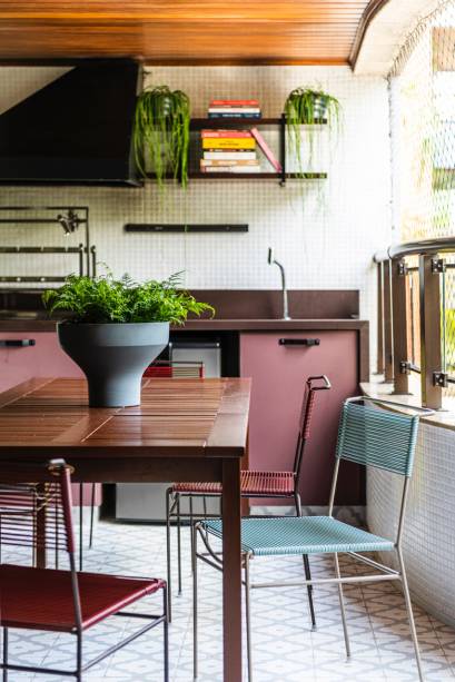 O primeiro pedido foi de integrar a cozinha já que o proprietário, que é dono de restaurantes, gosta muito de cozinhar para receber os amigos. Porém, para o dia a dia, a família gostaria de que fosse possível fechá-la. A solução foi incluir uma porta de rolar em madeira ripada, que dialoga com os demais ambientes.