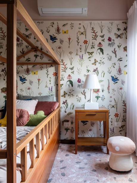 Na área íntima, o destaque fica para o quarto da filha, que conta com um belo papel de parede botânico, charmoso e delicado. Os temas naturais e paleta de cores mais queimadas são complementados pelo mobiliário em madeira e por um puff em formato de cogumelo. Confira todos os detalhes na galeria abaixo!