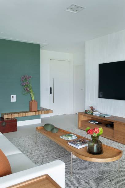 No geral, o projeto buscou criar um apartamento elegante, contemporâneo e funcional. Para isso, a arquiteta lançou mão de uma base branca com madeira freijó, pontuando com cores em locais estratégicos, como a parede de fundo da sala, revestida com papel de parede texturizado verde fechado, e os adornos – alguns verdes, outros em tons terrosos.