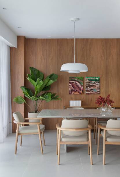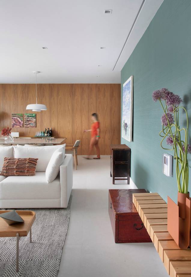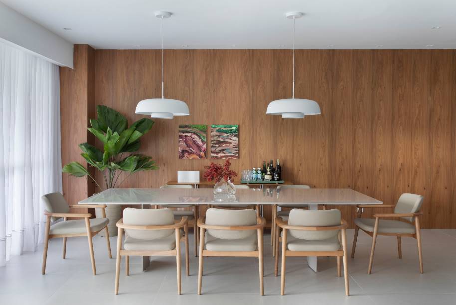 Na decoração é tudo novo, com exceção do baú e da mini cômoda (ambos de origem chinesa), que já faziam parte do acervo dos clientes e foram aproveitados na sala. Ainda na área social, a arquiteta investiu em móveis atemporais, sendo a maioria em tons claros para contrastar com o painel de madeira (que reveste a parede atrás da mesa de jantar) e a extensa parede verde, num tom mais fechado, para trazer elegância.