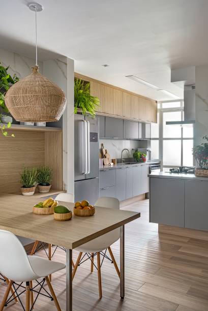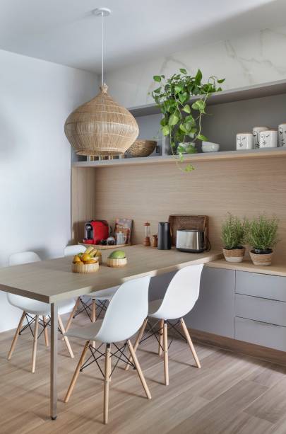 A arquiteta Amanda Miranda apostou em uma base branca neutra com madeira freijó, pontuada com toques de cor nas paredes e acessórios