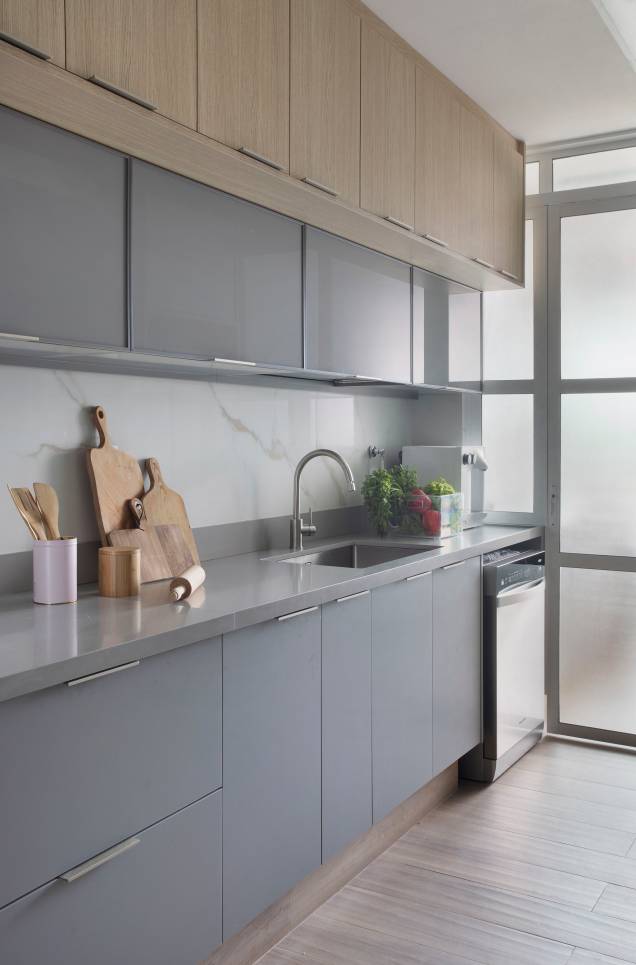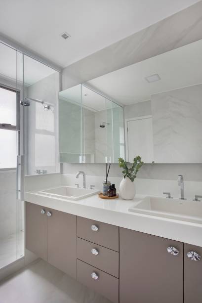 O efeito ripado nas portas do armário sob a bancada do banheiro de uma das suítes, que foi reproduzido no interior do box através do porcelanato que imita madeira; a porta de correr com vidro canelado entre a lavanderia (onde fica a janela) e a cozinha, que esconde o varal sem bloquear a entrada de luz natural; o uso dos mesmos materiais e acabamentos na cozinha e na lavanderia, que não só aumentou a sensação de amplitude como também de integração dos espaços.