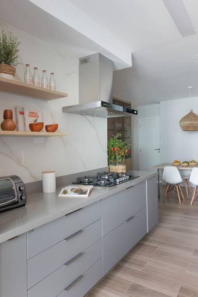 Na cozinha, Amanda destaca o uso de revestimentos claros, que trouxeram mais luminosidade e suavidade ao espaço, e o piso de porcelanato no padrão madeira, que não evidencia tanto a sujeira e ainda deixou o ambiente mais acolhedor.