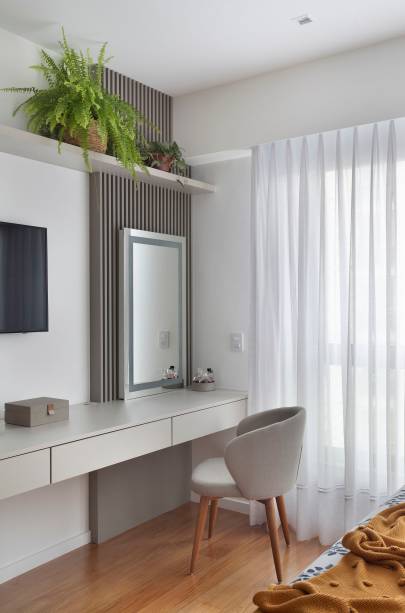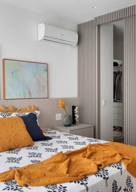 Já na suíte do casal, a cereja do bolo é, segundo a arquiteta, o painel ripado de marcenaria, com acabamento em laca cinza, que dispensou o uso de alvenaria para delimitar o espaço do novo closet, mimetizou a porta de acesso ele e ainda otimizou seu espaço interno.