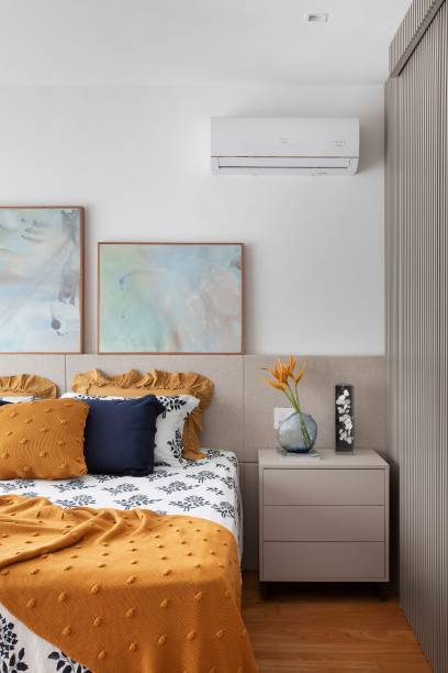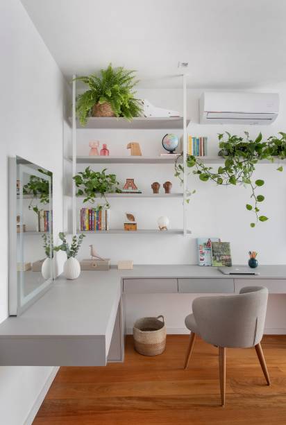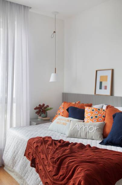 “Aqui, a base do décor é neutra, composta por marcenarias com acabamentos em tons de cinza e piso original em réguas de madeira escura, que foi restaurado. Os toques de cor aparecem na roupa de cama e nos quadros da artista Marcella Madeira, apoiados na cabeceira estofada em tecido cinza”, detalha a arquiteta.