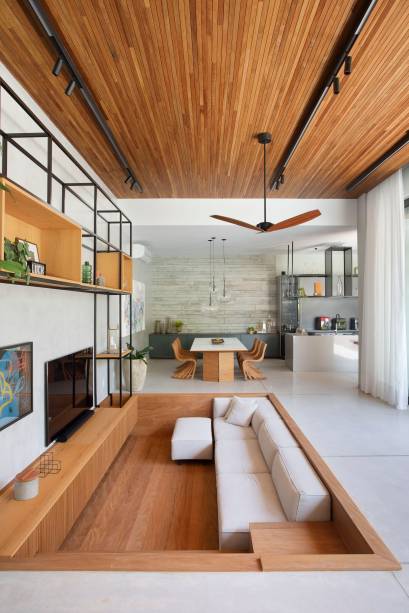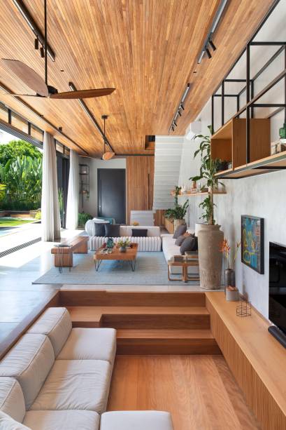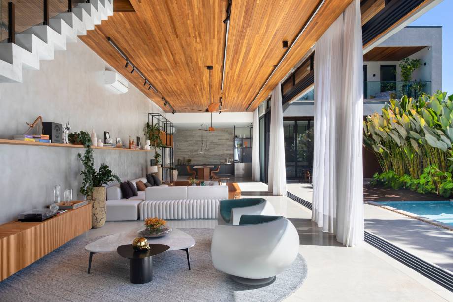 Pé-direito alto com teto ripado dá amplitude e beleza a casa de 635m²