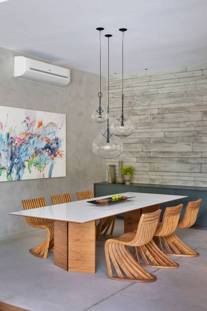 Na decoração, que segue o estilo contemporâneo carioca despojado, com toques de sofisticação e modernidade, alguns mobiliários já faziam parte do acervo dos moradores, como a mesa de jantar, as cadeiras Pantosh (da Lattoog Design), o sofá Gomos (da Líder Interiores) e as poltronas do lounge, que ganharam novo estofamento em tecido, num tom verde azulado.