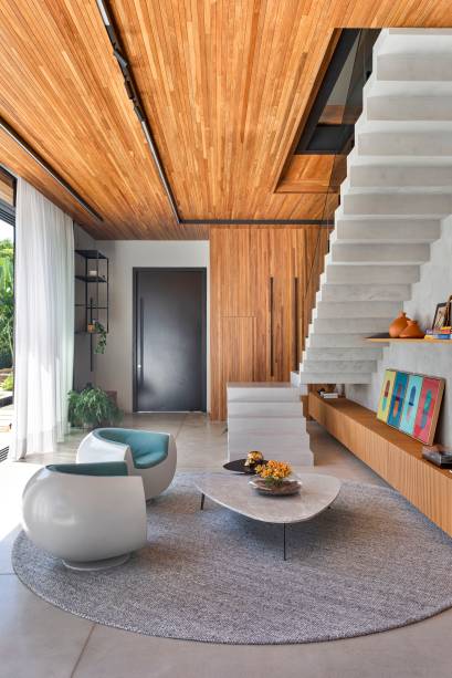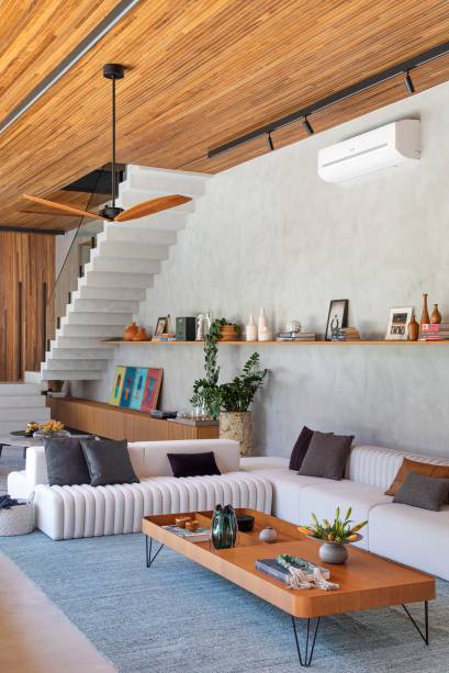 Na entrada, os arquitetos fizeram um hall aconchegante com uma chapelaria e, logo à frente da escada, um lounge se conecta ao estar principal da casa através do aparador ripado (com gavetas ocultas), fixado na parede ao fundo. Repare que este mesmo aparador aparece ainda no segundo ambiente de estar, rebaixado no piso, que funciona também como sala de tv.
