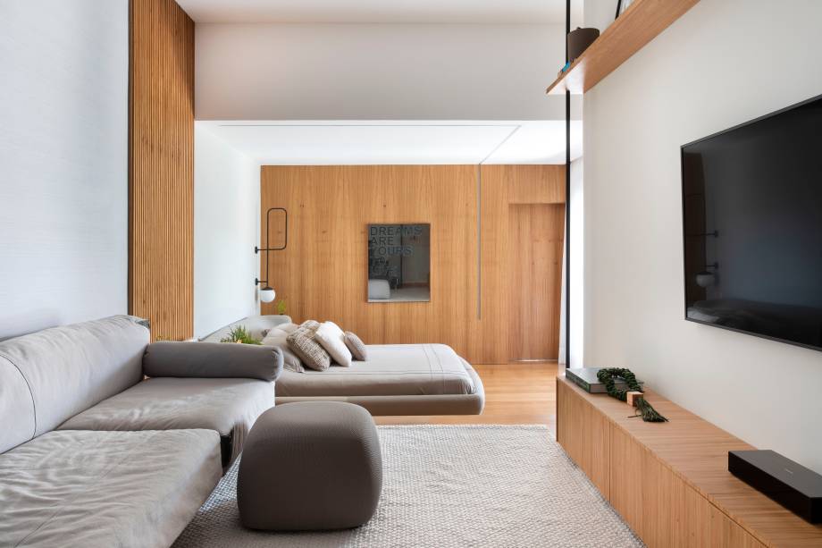 “O ponto alto da área social é o pé-direito de 4m, com teto forrado em madeira ripada, e a integração de três ambientes que conversam entre si, inclusive na linguagem visual”, avalia o arquiteto Thiago.