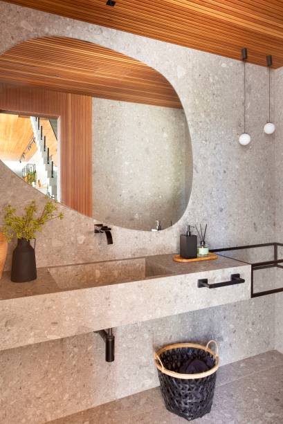 “Outro destaque é o mix de materiais naturais como madeira, linho, algodão e cimento. Combinado com uma paleta de cores em tons também naturais, como o castanho da própria madeira, as variações de verde da vegetação, o azul dos tapetes e o bege dos sofás, esse mix ajudou a ‘aquecer’ a base cinza existente da casa, com esquadrias de alumínio preto”, acrescenta ele.