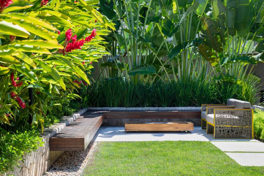 Com paisagismo assinado pela Landscape Jardins, a área externa – com 285m² – tem vegetação farta, além de espaços de contemplação e lazer, e segue a mesma linguagem do interior da casa, com muita madeira e tons naturais.