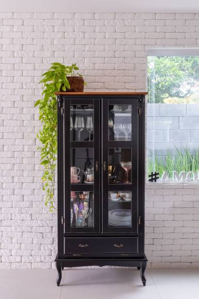Alguns pontos de cor ganham destaque ao longo do projeto, como o sofá azul, na sala, e cristaleira preta que, além de expor a paixão da moradora por canecas, traz um toque retrô ao projeto.