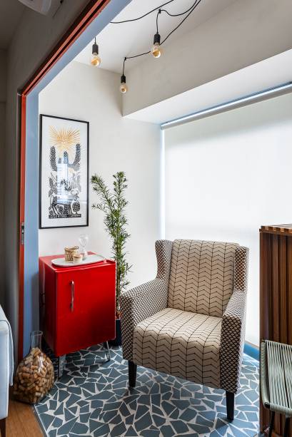 Pilar descascado e piso de caquinhos dão personalidade a este apê