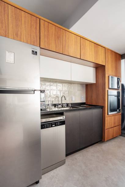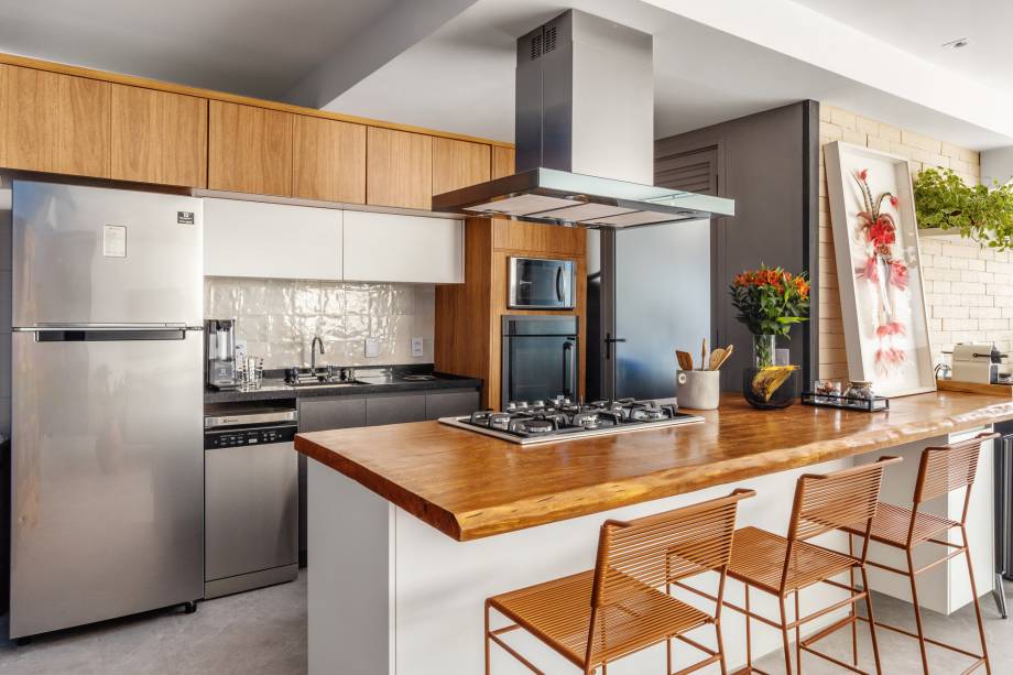 A sala, cozinha e área gourmet são integradas. O piso vinílico marmorizado e os móveis de madeira servem como elementos de ligação visual entre os cômodos. Na cozinha americana destacam-se os tons de cinza e a ilha com bancada em formato orgânico.