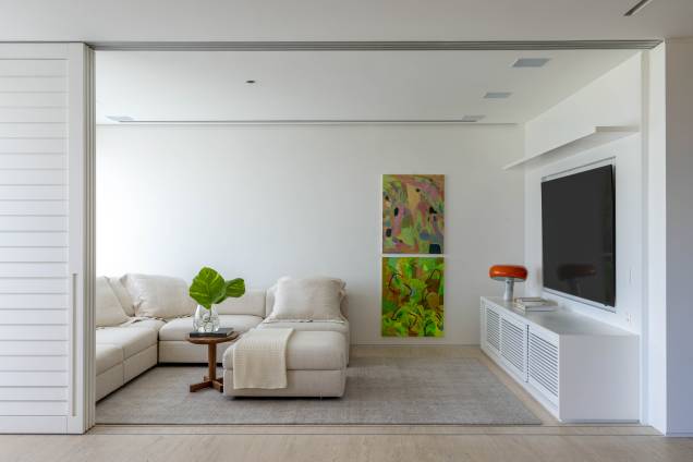Portas de correr caribenhas com venezianas delimitam sala de TV em apê