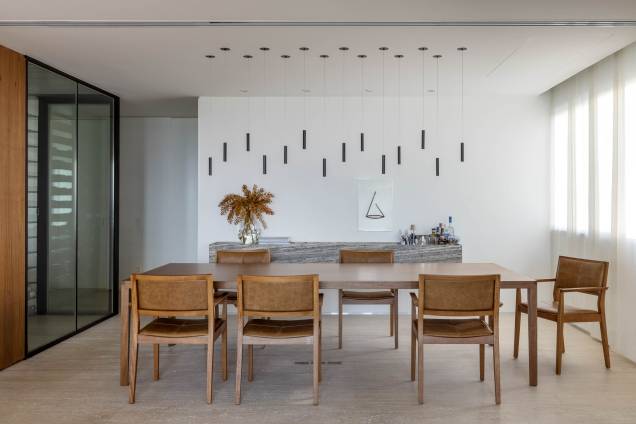 O projeto, assinado pelo escritório LessaZanetta, criou uma área social integrada, com uma grande adega com paredes de vidro.