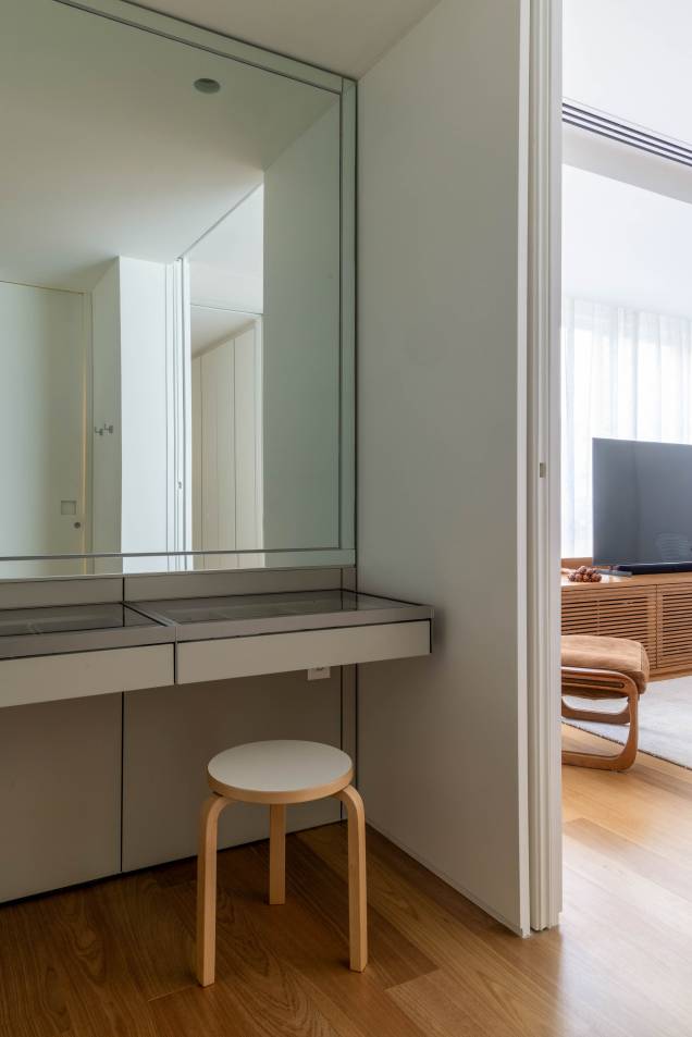 No banheiro, a grande bancada ganhou uma área para maquiagem integrada ao quarto.