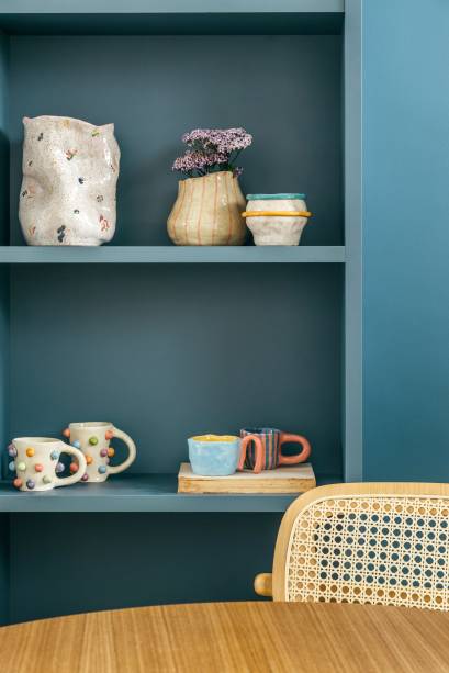 “Como a cozinha ficou instalada em uma parede com dois basculantes, usamos uma prateleira de ponta a ponta para emoldurar a parte inferior dos vãos. Na parte superior, instalamos armários até o teto, também em toda a extensão da parede, para guardar itens que não serão tão usados no dia-a-dia”, detalha ele.
