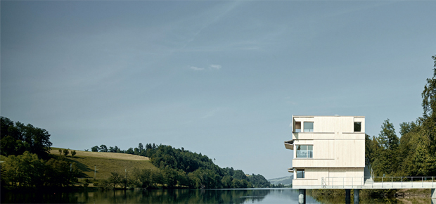 À beira do lago Rotsee, na Suíça, este prédio de madeira traz painéis flexíveis, que dão um efeito visual dinâmico à fachada e evitam a colisão de pássaros