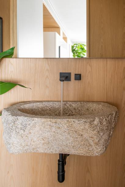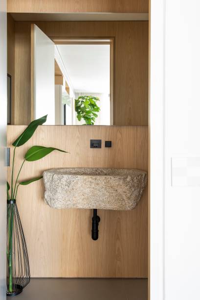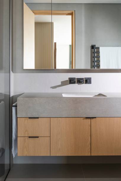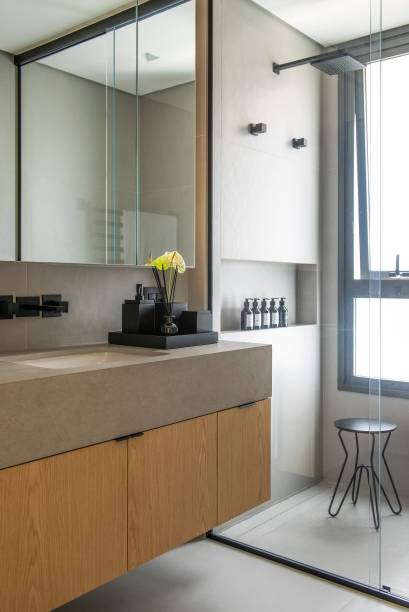Simples e elegante, o banheiro do casal segue os tons do quarto, revestido de porcelanato cinza e receber armários com marcenaria em tons claros.