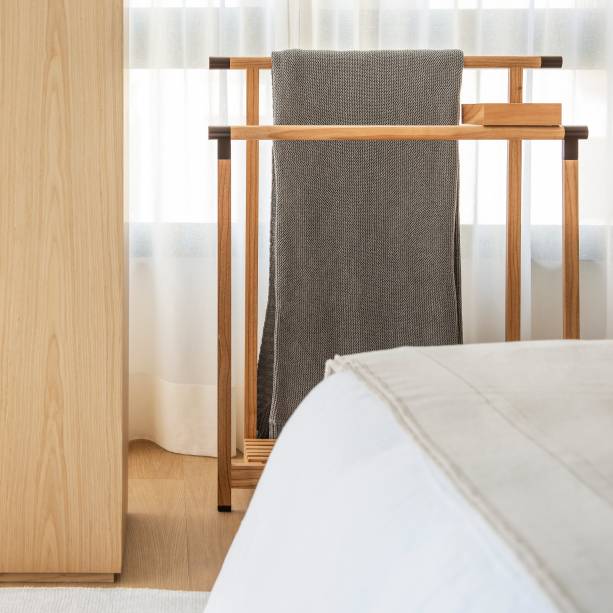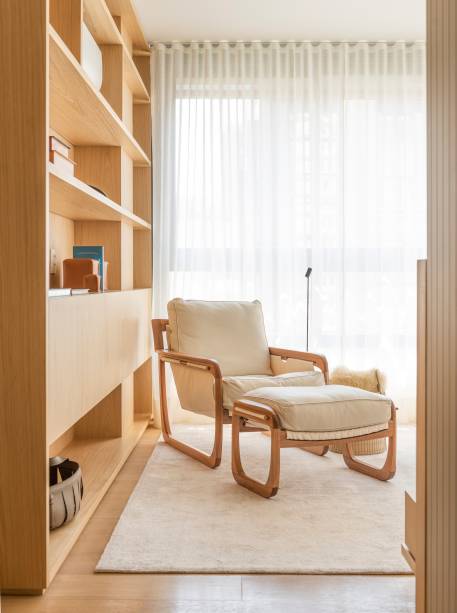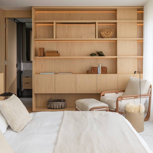Para a área da cabeceira, foi escolhida uma peça de marcenaria que funciona como divisão entre o quarto e o closet. Ao lado da cama, foi criado um espaço de leitura com Poltrona e banco Pitu, de Aristeu Pires, e uma estante para os livros e objetos pessoais dos moradores.