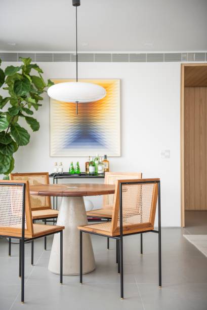 A área do bar, situada entre a sala de televisão e o living, foi pensada especialmente para momentos de descontração dos moradores com a família e amigos e é composta por uma mesa com tampo redondo de madeira Cumaru e base de concreto e quatro cadeiras de palha, que remetem a características do artesanato brasileiro. Encostado na parede, um carrinho com estrutura de aço preto atua como suporte para as bebidas.