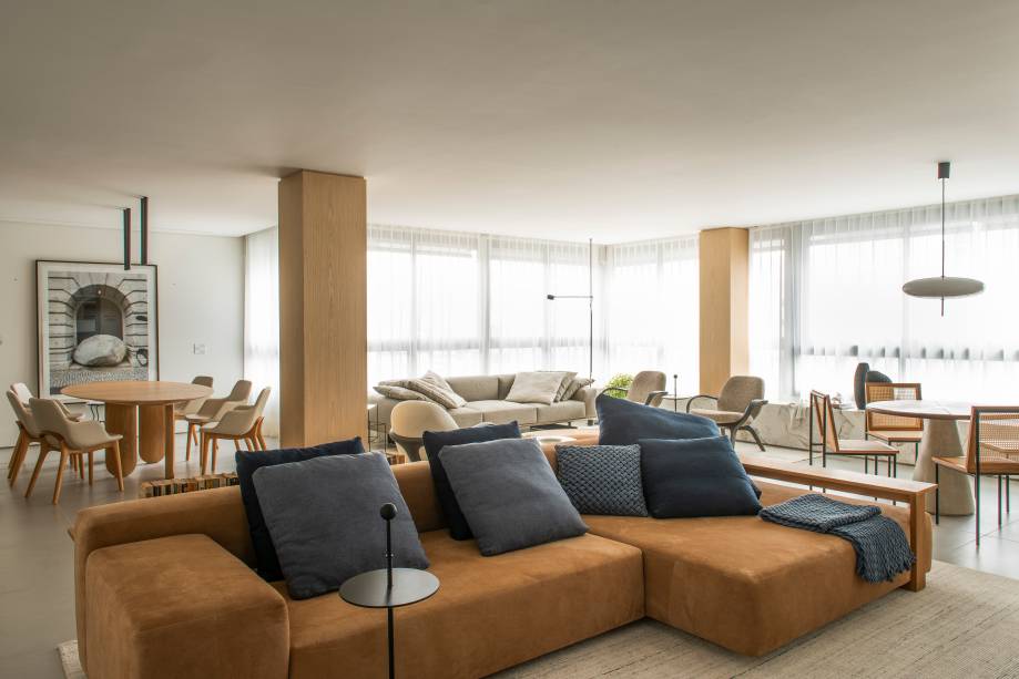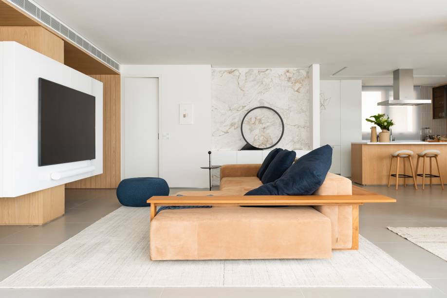 Um bom exemplo disso é a área social, planejada para ter todos os ambientes integrados. Na sala de televisão, logo na entrada do apartamento, a mistura de materiais e texturas se faz presente. O sofá e as almofadas, além de receberem um tecido confortável ao toque, criam um contraste com a paleta clara escolhida para o projeto.