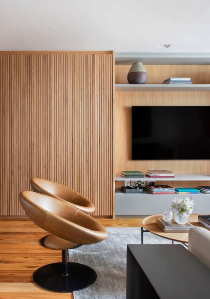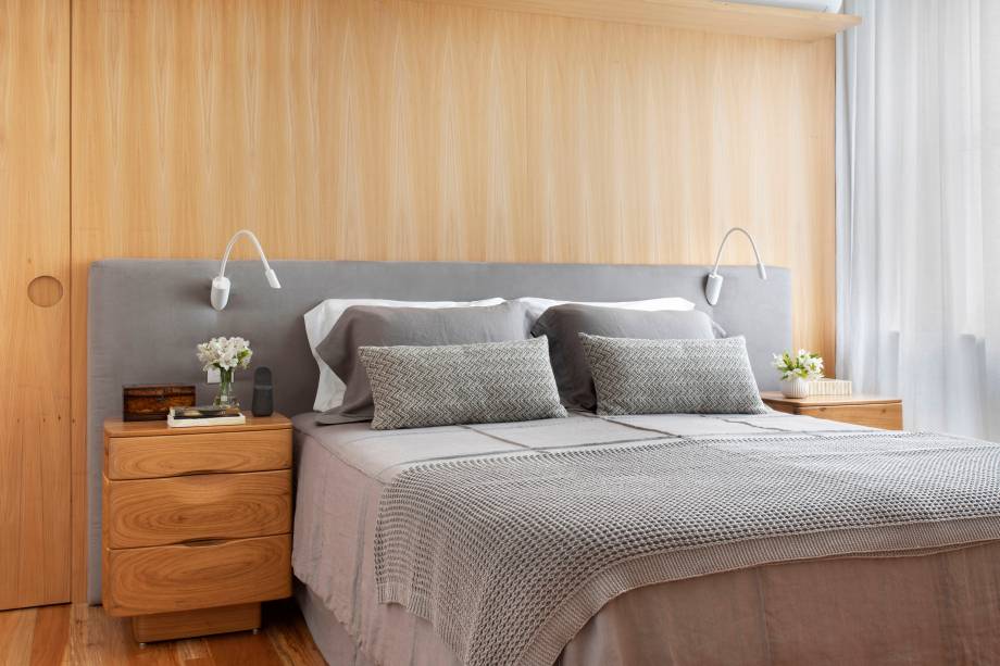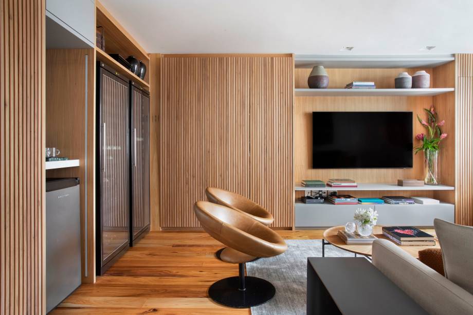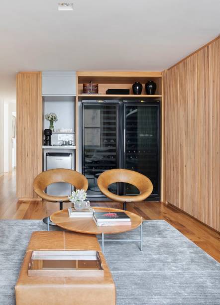 “Eles queriam ter muito espaço de armários, conforto para ver TV sozinhos ou com os netos, além de banheiros claros e clean, pois os antigos tinham materiais escuros. Eles também pediram ao escritório para encaixar no projeto duas adegas grandes que já possuíam”, conta Maurício.