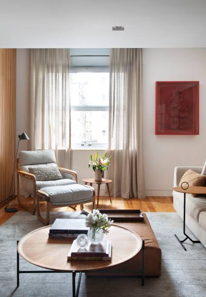 “Privilegiamos o mobiliário brasileiro contemporâneo, que é uma de nossas paixões. Destaque para a chaise Pitu, de Aristeu Pires, que é uma aula de ergonomia e conforto, e também para as poltronas Anel 80’s, de Ricardo Fasanello, icônicas do design brasileiro dos anos 80”, informa Alice.