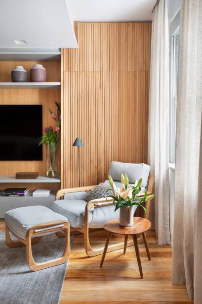 Para complementar a madeira, foram escolhidos tons neutros e claros nas paredes e no mobiliário para criar uma sensação de harmonia e conforto.