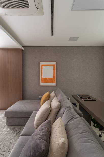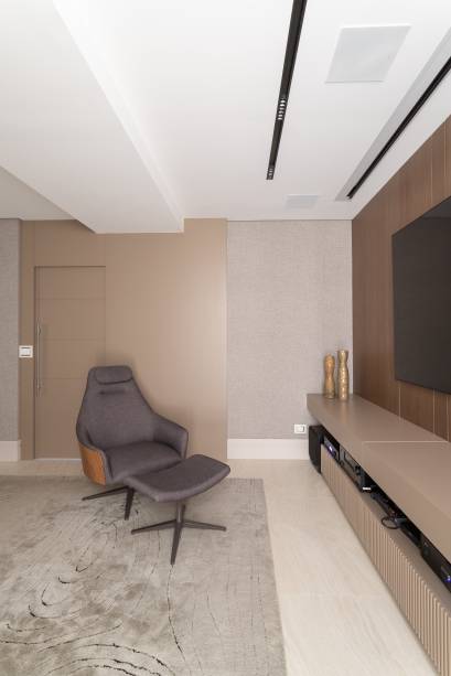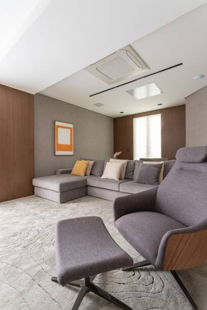 O home theater tornou-se mais generoso ao ser integrado a um dos quartos. A lâmina natural de madeira escurecida, que reveste a parede, garante o clima intimista quando combinada com o papel, trazendo uma textura delicada. Com uma chaise em uma das pontas, o sofá oferece lugar para todos.