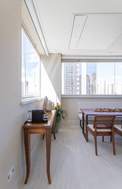 Com vista para as copas das árvores do bairro, a varanda é uma atração à parte. Reforçando a sensação de integração com o living, o mesmo material reveste o piso dos dois ambientes. No mobiliário, peças do acervo da cliente foram dispostas junto às novas, de maneira estratégica, estimulando conversas informais e momentos de descontração.